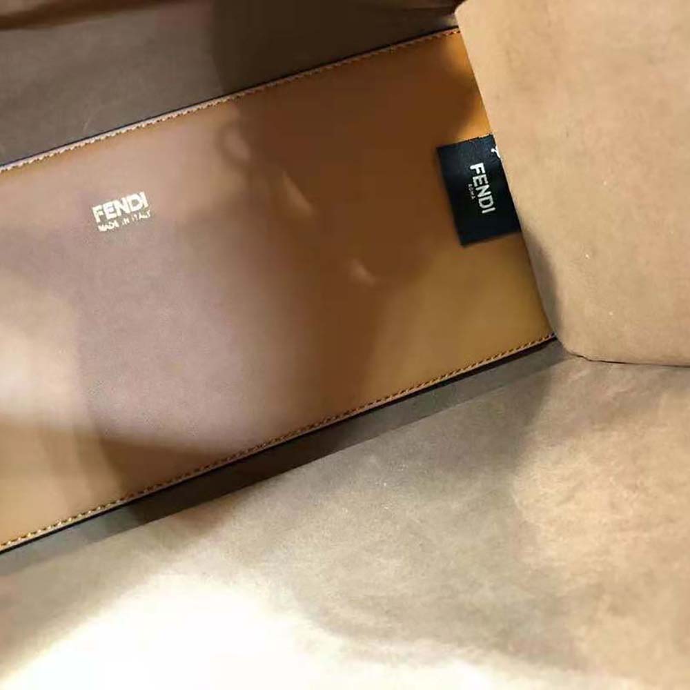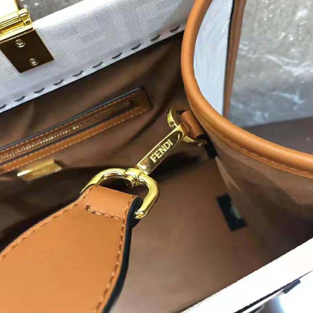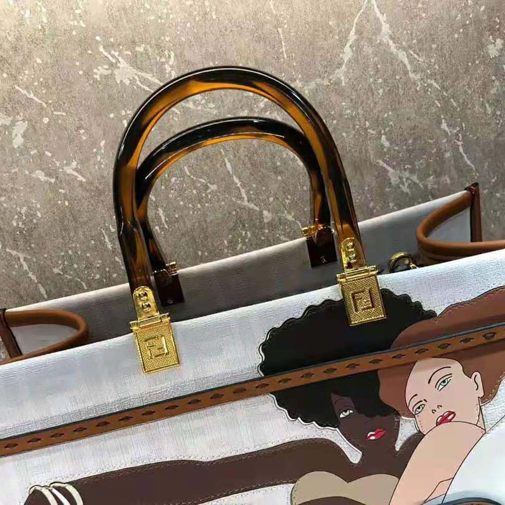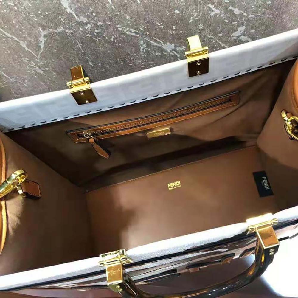 Medium Sunshine Shopper bag in white glazed fabric with tone on tone printed FF motif and beige.