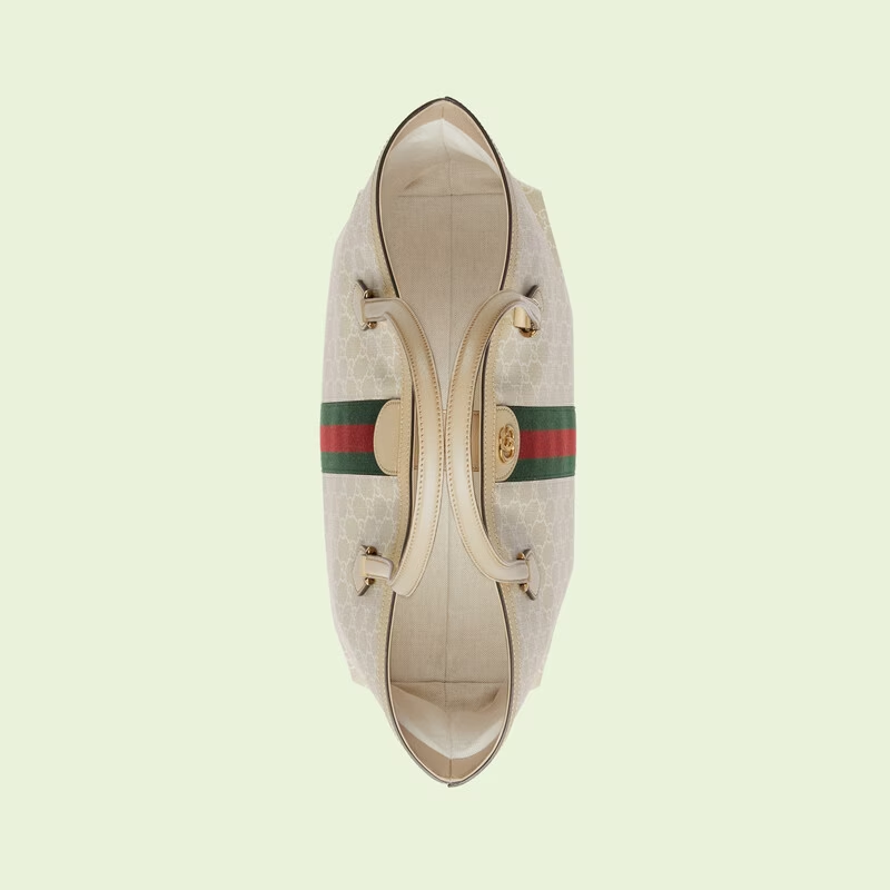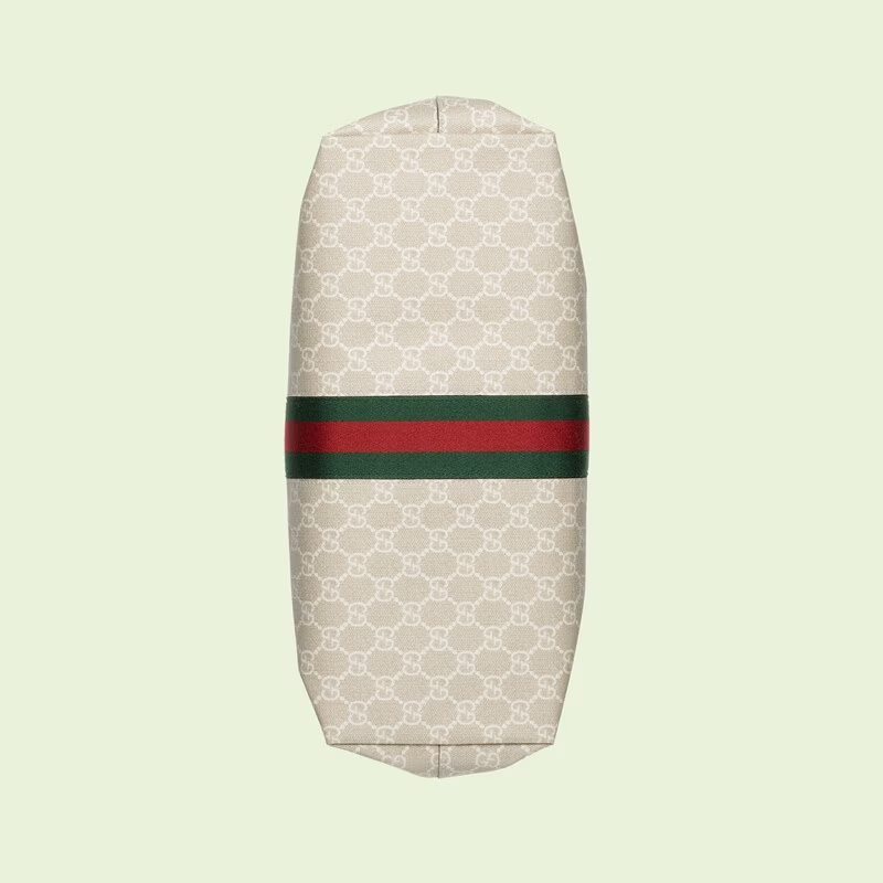 A heritage material from the archive. GG Supreme has been reimagined in GG Love Parade in different color combinations and combined with contemporary as well as classic styles. The Ophidia tote is presented in a beige and white variation of the signature material with a tonal trim. Originally a play on a '30s design. the canvas speaks to the historical narrative that runs throughout the collection.